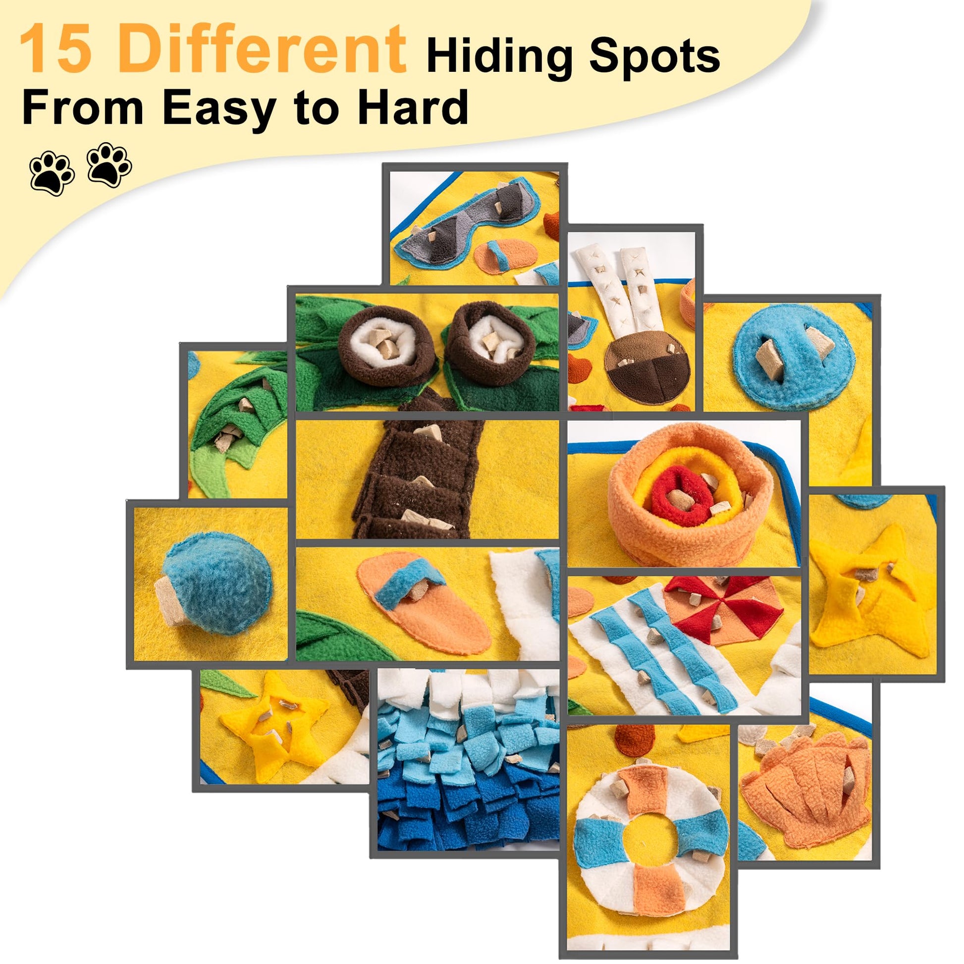 - Interactive Smell Training: This Snuffle Mat is designed to provide engaging and stimulating smell training for dogs and cats. With 15 different training elements, it offers a variety of hiding spots for treats or kibble, encouraging pets to use their keen sense of smell and problem-solving skills to find their rewards.